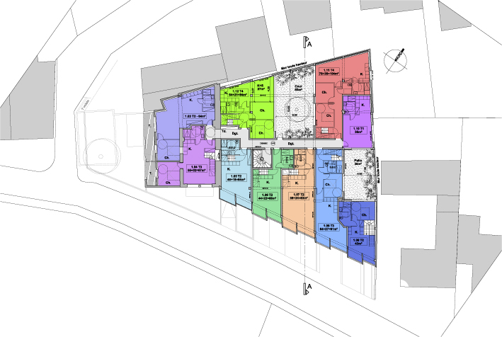 La contrainte de la trame structurelle impose le développement des logements en peigne autour de deux patios creusés dans le bâtiment. Ces cours intérieures permettent de dédensifier la parcelle, d’apporter de la végétation en cœur de projet et de la lumière dans les logements.