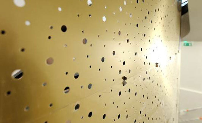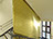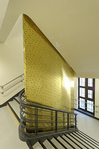 On entre dans le bâtiment au rez-de-chaussée par un sas doré donnant sur l’accueil. L’accès aux étages se fait par un escalier rénové qui devient le cœur du projet. Le noyau de cet élément est constitué d’une ellipse dorée et perforée qui diffuse des rayons de lumière.