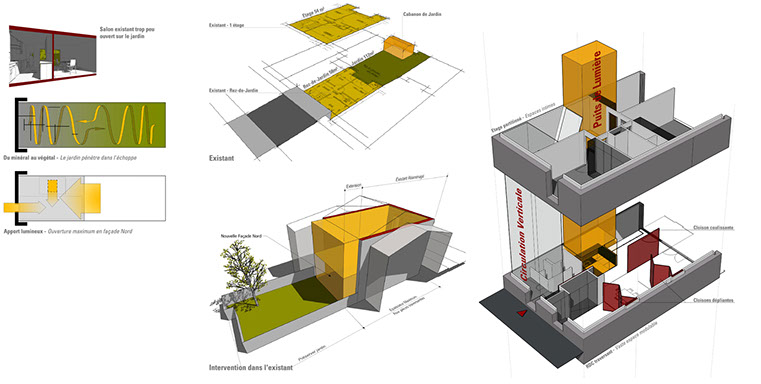 Le projet affirme le passage du minéral au végétal, par une évanescence des cloisonnements dans l’espace de vie.