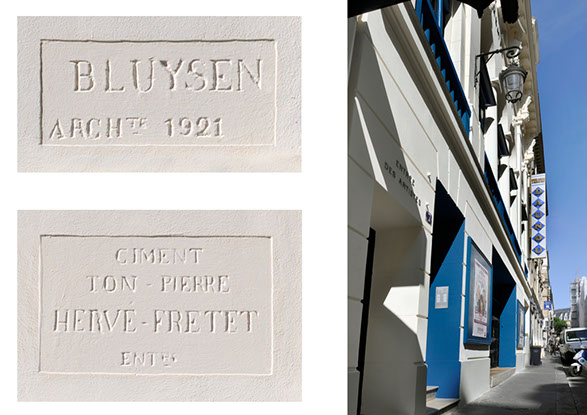 Les recherches lors du nettoyage de cette façade en béton ont permis de lui rendre son dessin initial, en lui restituant le traçage des joints et les signatures de l'architecte et de l'entreprise, cachés sous les couches successives d'enduit et de peinture.