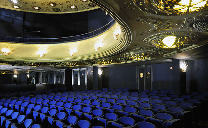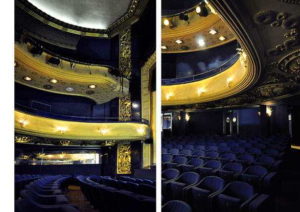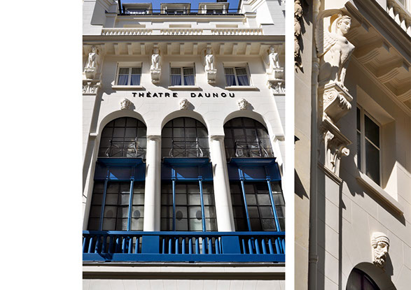 Ce travail a aussi été l'occasion d'une recherche sur les teintes d’origine de la façade et, accompagné des services du patrimoine de la Ville de Paris, de réintégrer la couleur bleue si importante à l’identité de ce théâtre dont la décoration de la salle intérieure a été réalisée par la Maison Lanvin Décoration.