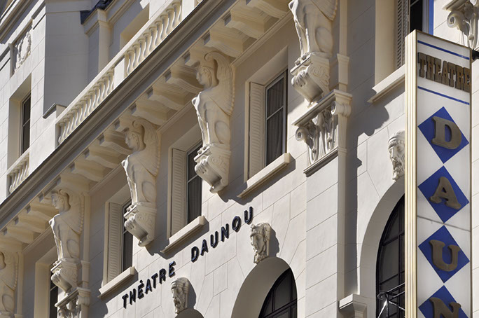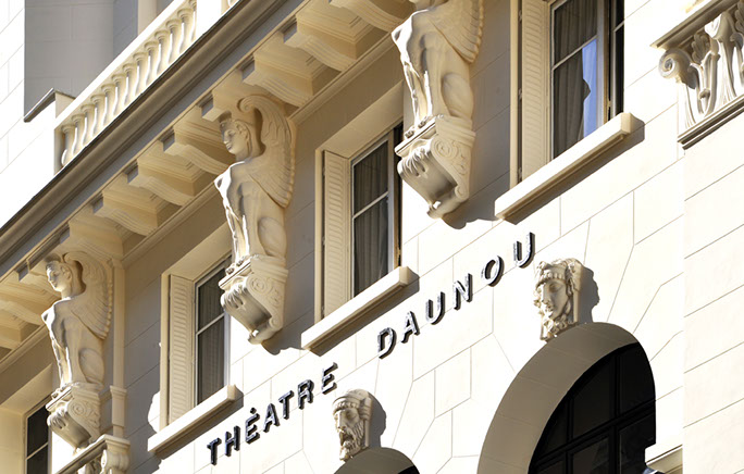 Au sein de le rue Daunou, la façade du théâtre conçu par l'Architecte Auguste Bluysen en 1921 fait exception.