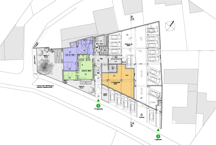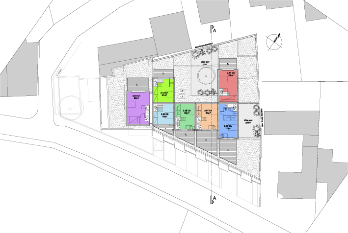 La contrainte de la trame structurelle impose le développement des logements en peigne autour de deux patios creusés dans le bâtiment. Ces cours intérieures permettent de dédensifier la parcelle, d’apporter de la végétation en cœur de projet et de la lumière dans les logements.
