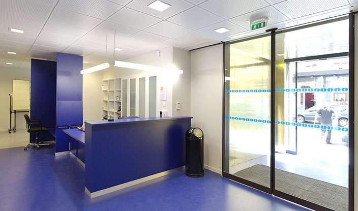 On entre dans le bâtiment au rez-de-chaussée par un sas doré donnant sur l’accueil. L’accès aux étages se fait par un escalier rénové qui devient le cœur du projet. Le noyau de cet élément est constitué d’une ellipse dorée et perforée qui diffuse des rayons de lumière.