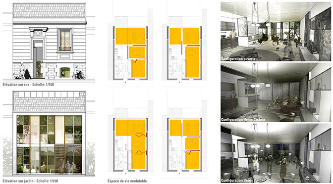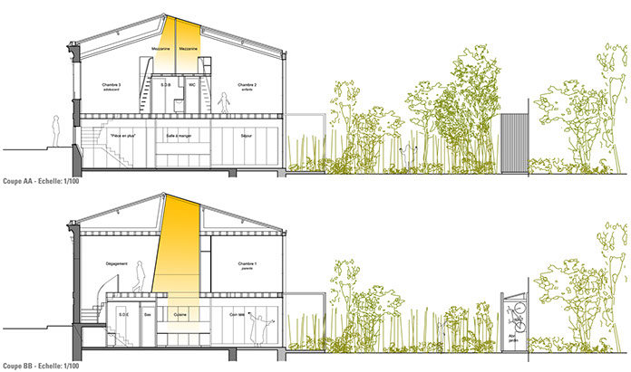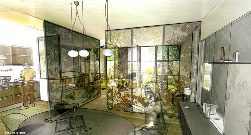 Le projet affirme le passage du minéral au végétal, par une évanescence des cloisonnements dans l’espace de vie.