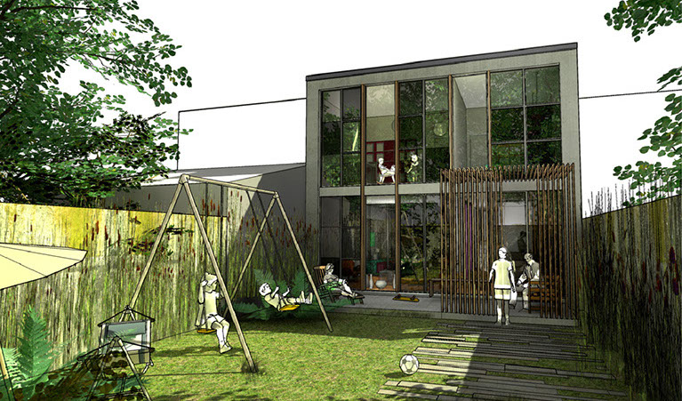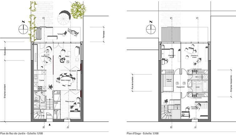 Cette façade contraste avec celle très minérale de la rue, pour s’ouvrir sur cet espace vert en cœur de ville, éclairant l’échoppe dans sa profondeur.